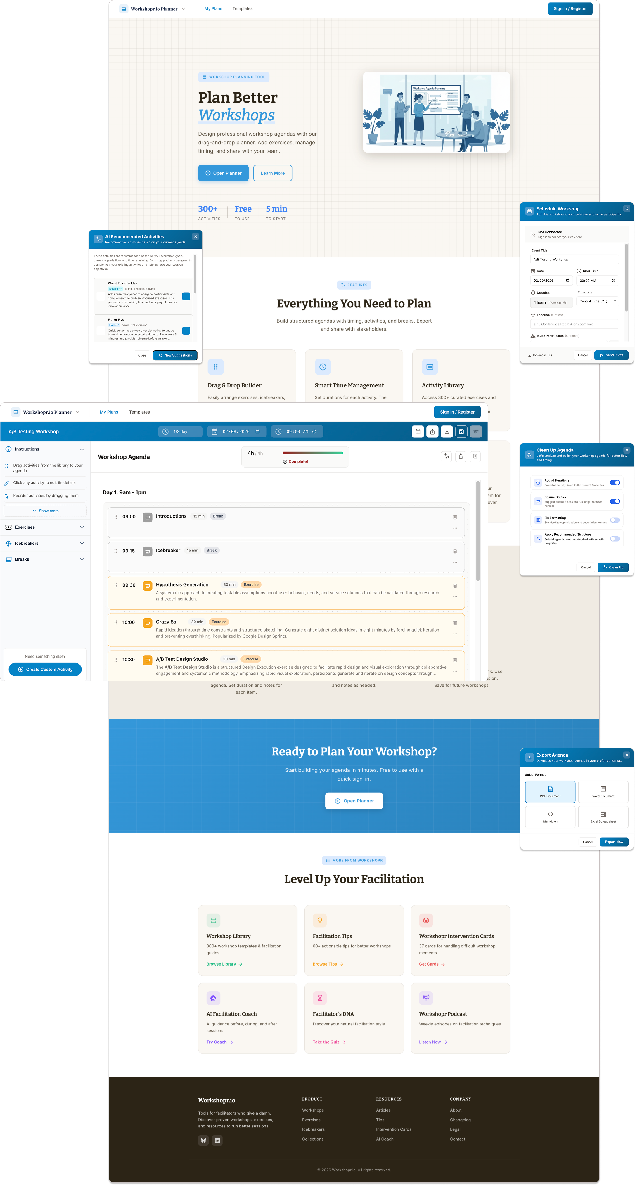 Facilitators build agendas in spreadsheets. They manually add up durations, guess at timing, and lose track of which exercises they planned to use. When a workshop runs long, they don't know what to cut because they can't see the whole picture.