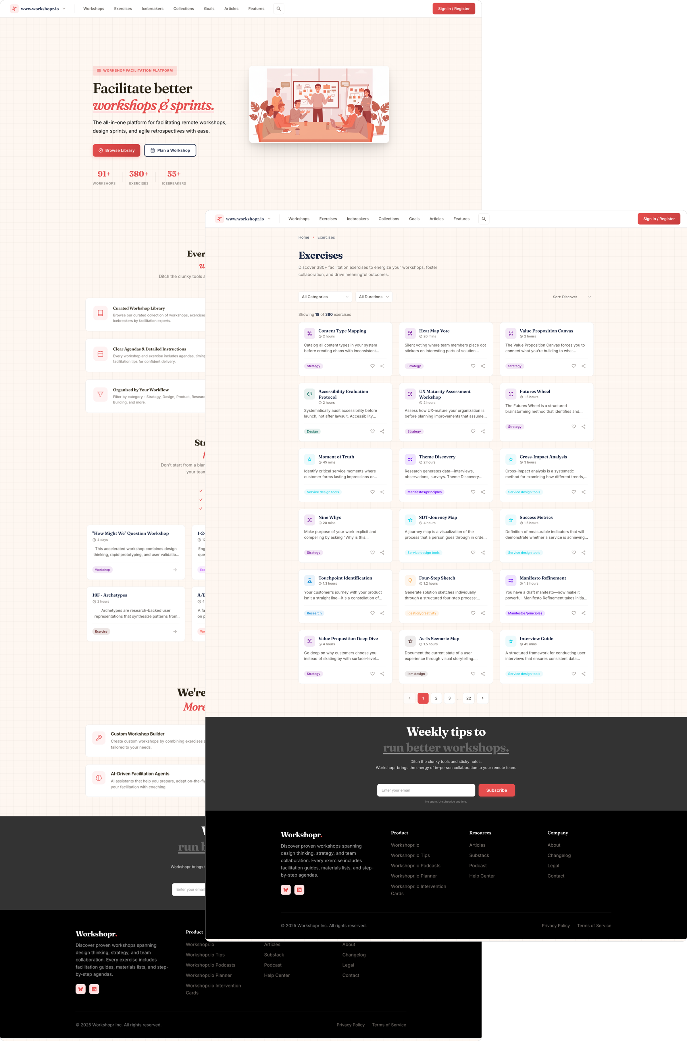 Workshopr.io is four connected products sharing a design system, a content library, a user model, 3 micro-sites, a weekly podcast, and a Substack with over 50 articles, and 3 published weekly.